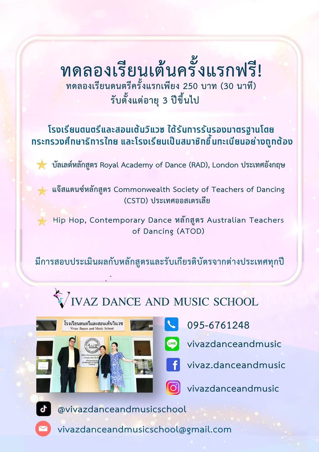 โรงเรียนดนตรีและสอนเต้นวิแวซ สังกัดโรงเรียนการศึกษานอกระบบ ได้รับการรับรองการศึกษาโดยกระทรวงศึกษาธิการไทย แต่เดิมชื่อ Vivace Dance and Music (วิวาเช่) ก่อตั้งขึ้นเมื่อเดือนกรกฎาคม พ.ศ.2556โดยครอบครัววิริโยทัย ประกอบไปด้วย ครูแทน นายสันติภาพ วิริโยทัย, ครูเอ นางสลินทรา วิริโยทัย และครูโบว์ นางสาวปฐมาภรณ์ วิริโยทัย คุณครูทั้งสามท่านมีปณิธานมุ่งมั่นในการเผยแพร่ทักษะความรู้ทางด้านศิลปะ ดนตรีและเต้นให้แก่ผู้เรียนผ่านการเรียนการสอนที่สนุกสนาน แต่ยังคงความถูกต้องตามแบบแผนและเป็นไปตามหลักมาตรฐานระดับสากล (Dance and Play with lively mood)