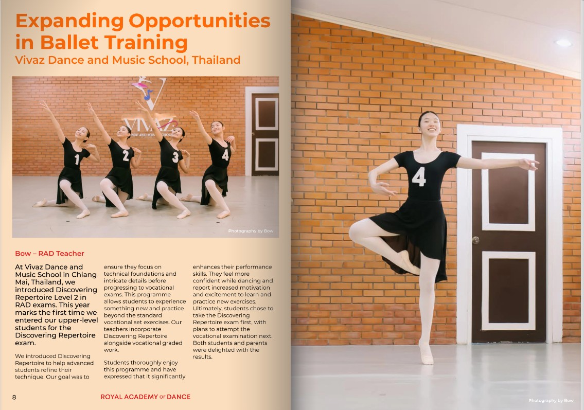 อีกหนึ่งความภาคภูมิใจและก้าวสำคัญของโรงเรียนดนตรีและสอนเต้นวิแวซ ที่ได้รับเกียรติรับเลือกสัมภาษณ์ลงนิตยสารออนไลน์ระดับสากลอย่าง “Focus on Exams” ฉบับที่ 1 ประจำปี 2026 โดยสถาบัน Royal Academy of Dance (RAD) กรุงลอนดอน ประเทศอังกฤษ