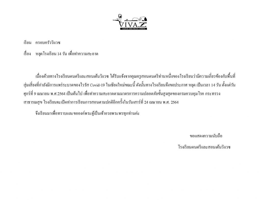 ประกาศ โรงเรียนหยุด 14 วัน ตั้งแต่ 9-23 เมษายน พ.ศ.2564 เปิดทำการเรียนการสอนปกติอีกครั้ง 24 เมษายน พ.ศ.2564
